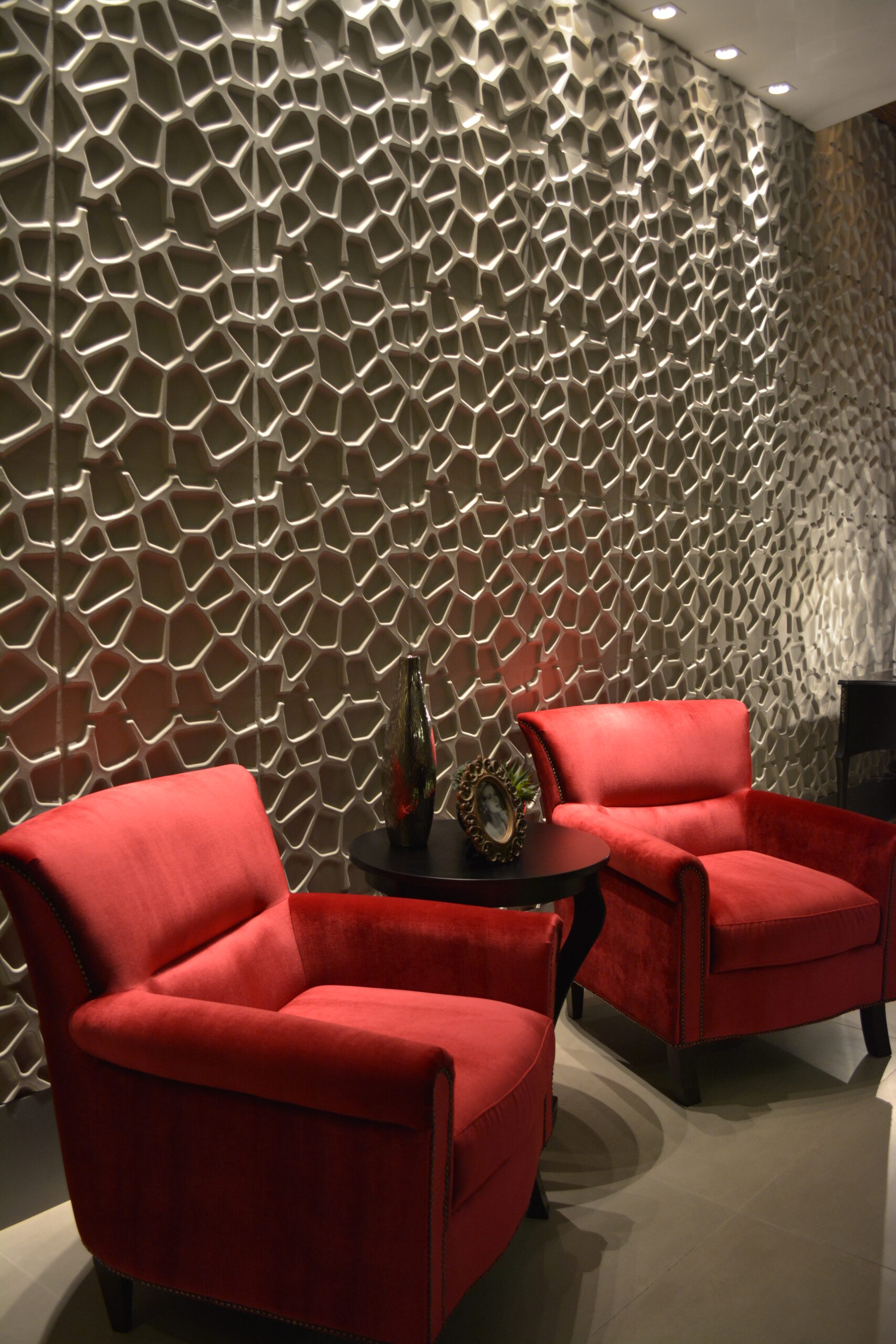 Metalon utilizado de forma escultórica, e painéis feitos com fibra vegetal reciclada (de cana).
