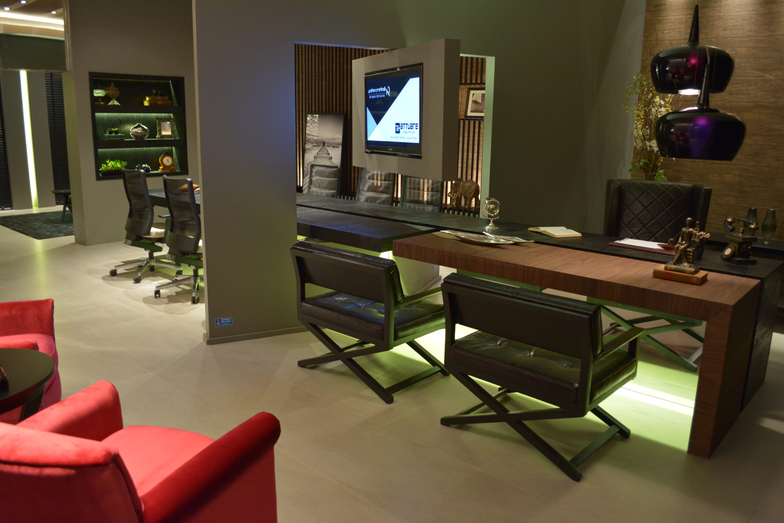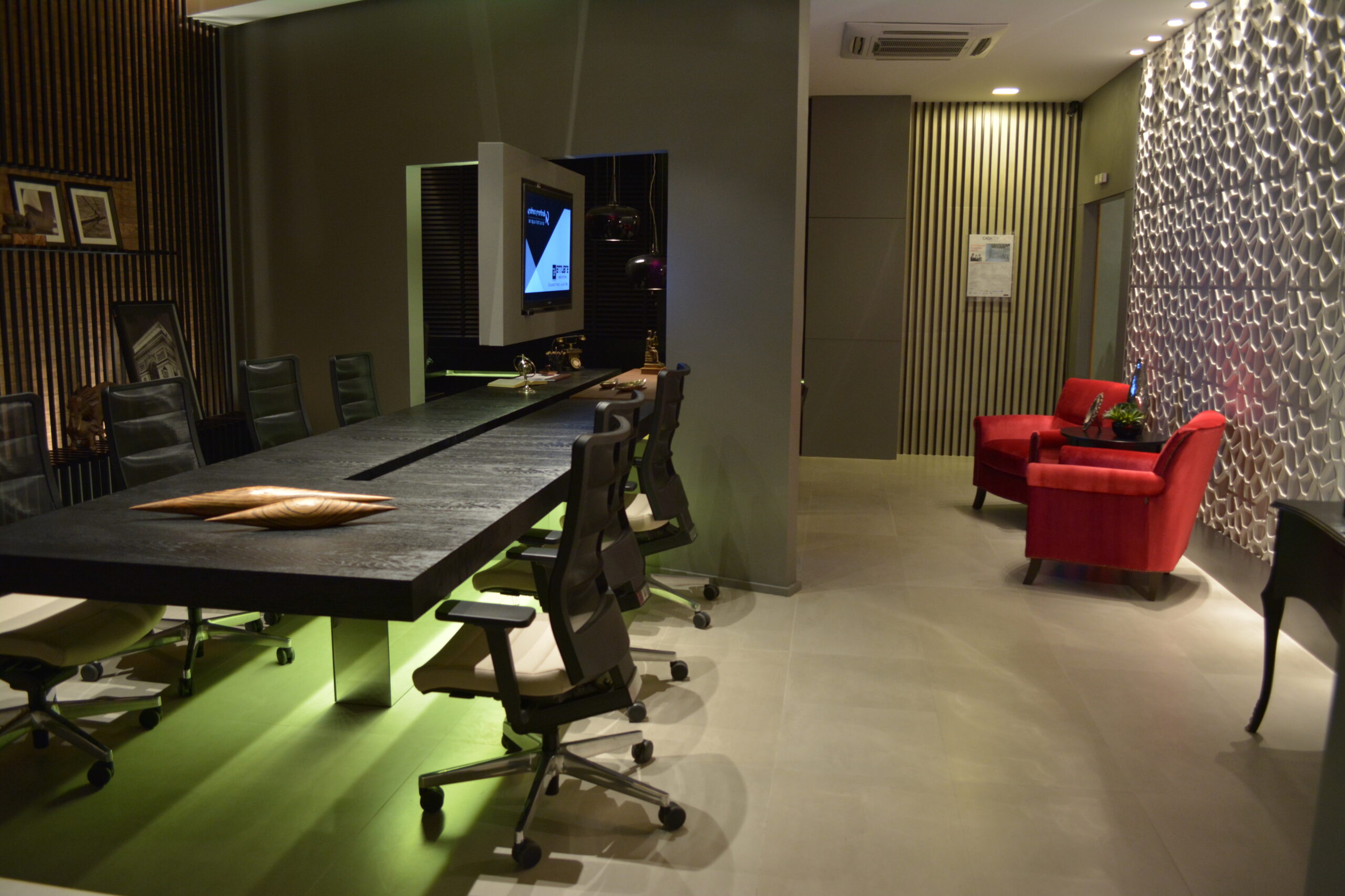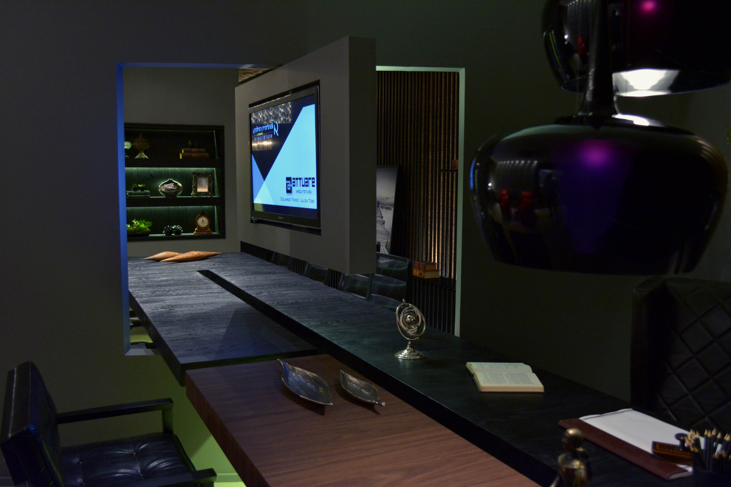 Mesa e tv que conectam sala de reunião com a sala do advogado.