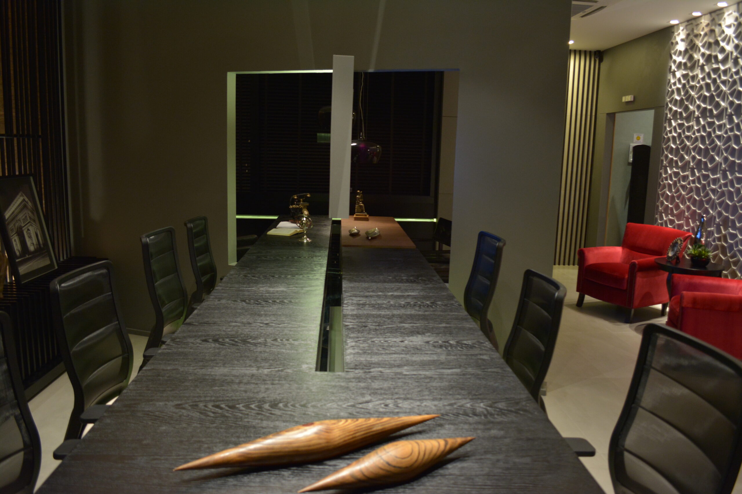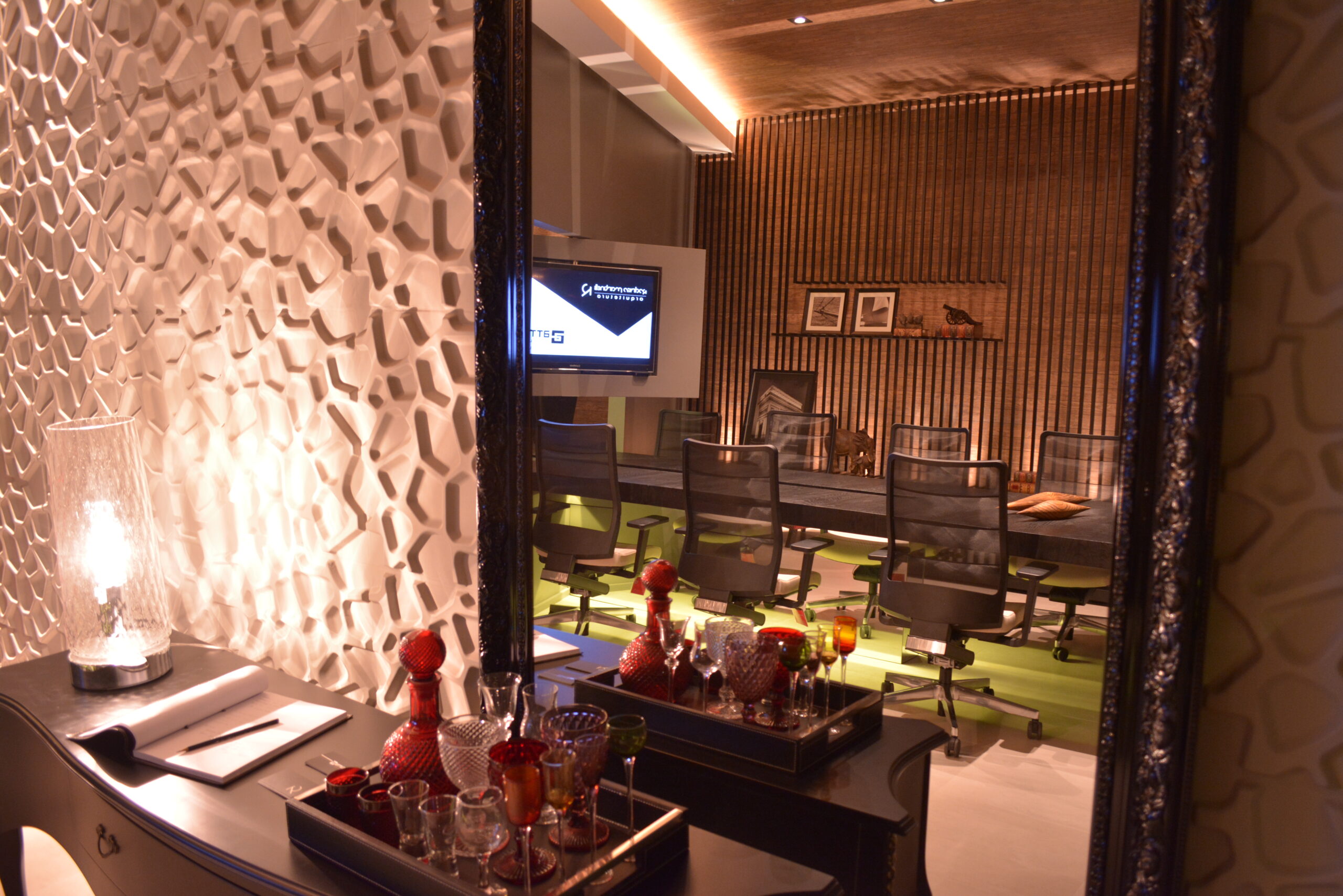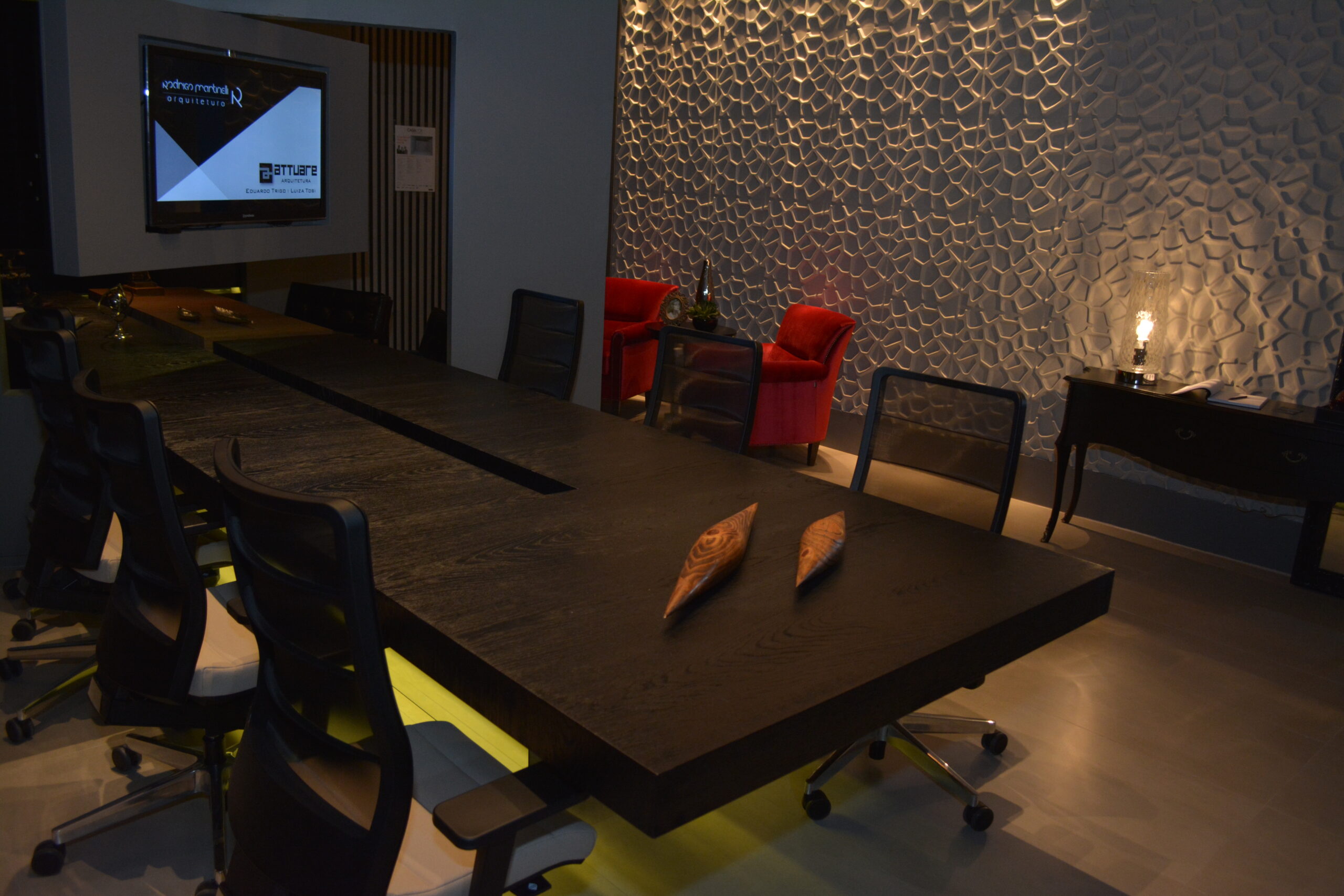 Mesa e tv que conectam sala de reunião com a sala do advogado.