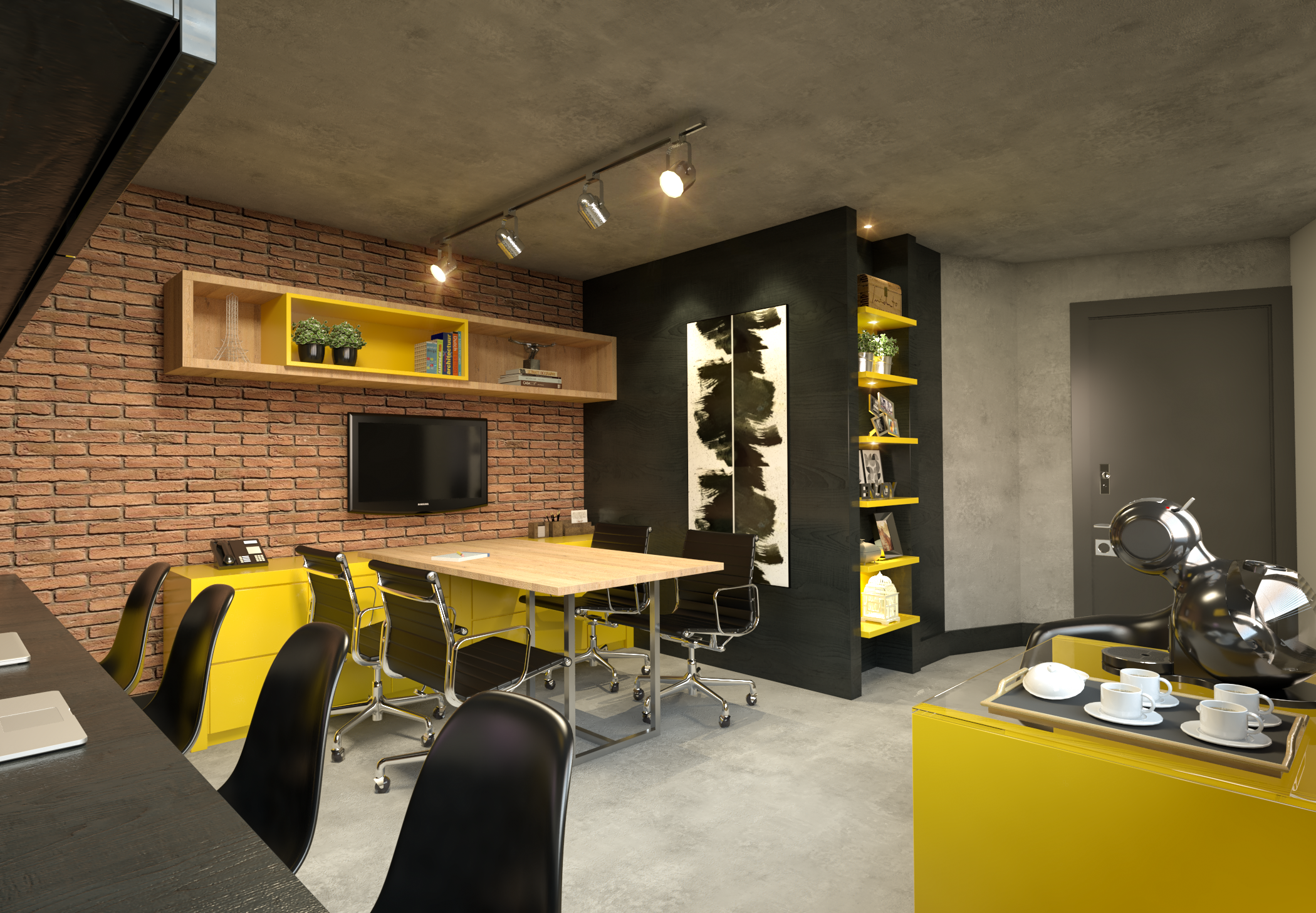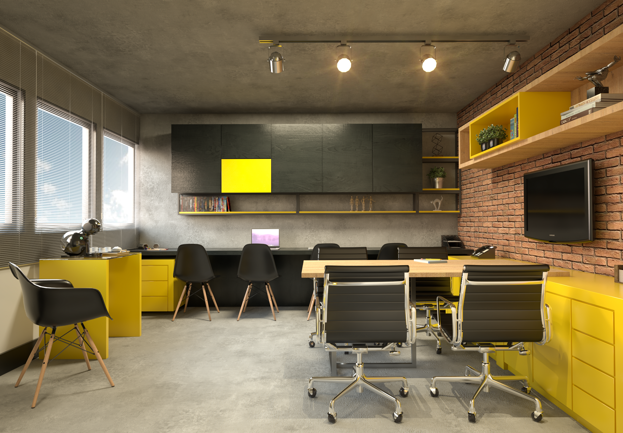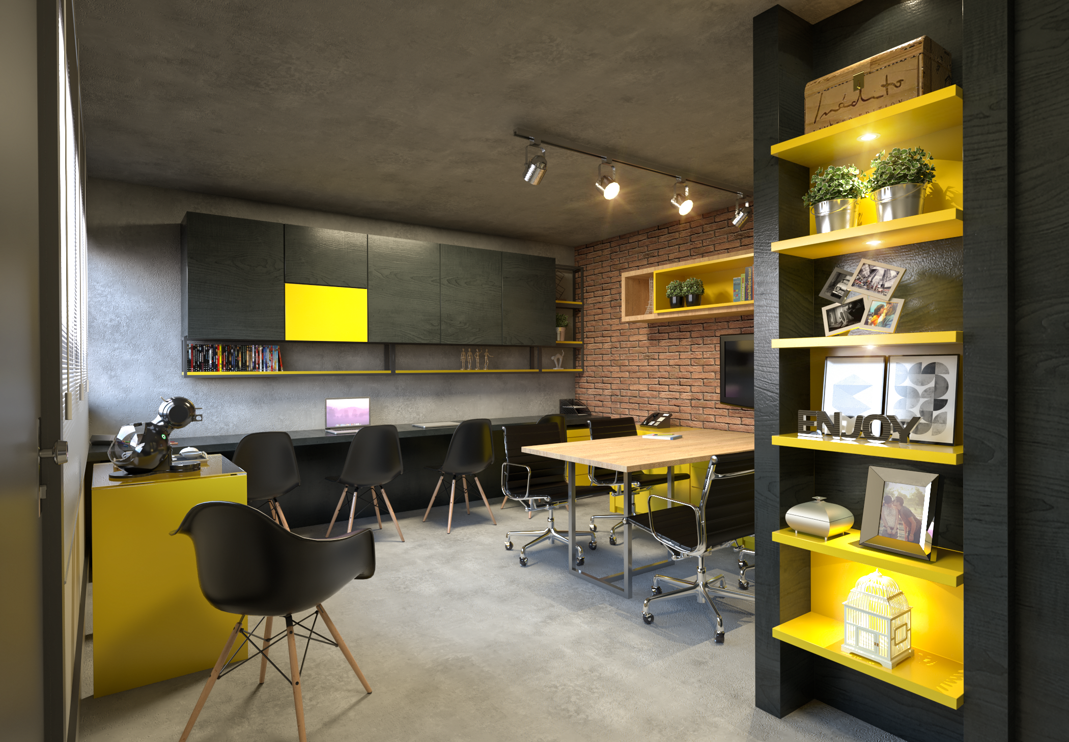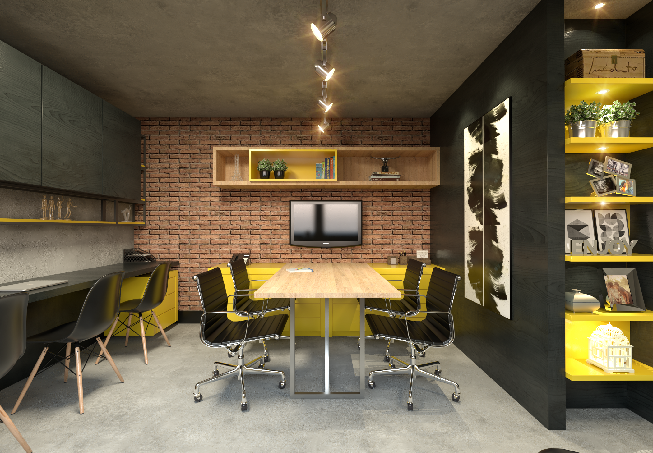 Lâmina Natural Ebanizada, cimento queimado e tijolinho aparente.